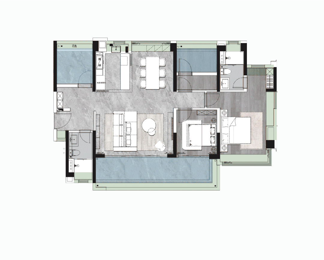 8.3米宽的阳台和次卧相连,形成跑道式阳台,带来一览无遗的视野,将园林、江景尽收眼底。
