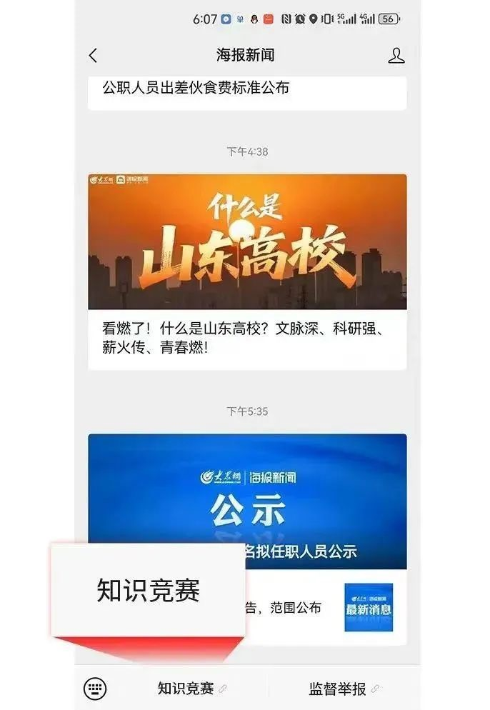 搜索“海报新闻”微信公众号,或扫描下方二维码进入,点击“关注”之后,在菜单栏进入“知识竞赛”活动,进行学习、答题。