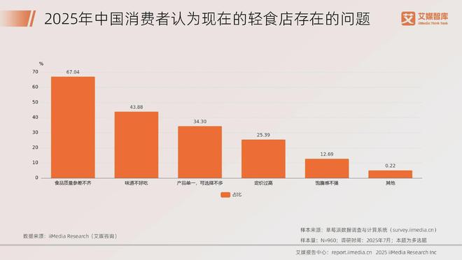 数据显示,在2025年中国消费者对轻食店存在的问题的调查中,食品质量参差不齐的问题最为突出,占比高达67.04%,远高于其他问题。其次是味道不好吃,占比43.88%,而产品单一、可选择不多的问题也较为明显,占比34.30%。定价过高的问题占比25.39%,饱腹感不强的问题占比相对较低,仅为12.69%。其他问题占比最低,仅为0.22%。艾媒咨询分析师认为,品质与口味是当前轻食行业的核心痛点,严重影响用户体验与复购意愿。未来品牌需聚焦供应链管理与菜品研发,在保障安全稳定的基础上打造差异化风味,以突破市场发展瓶颈。
