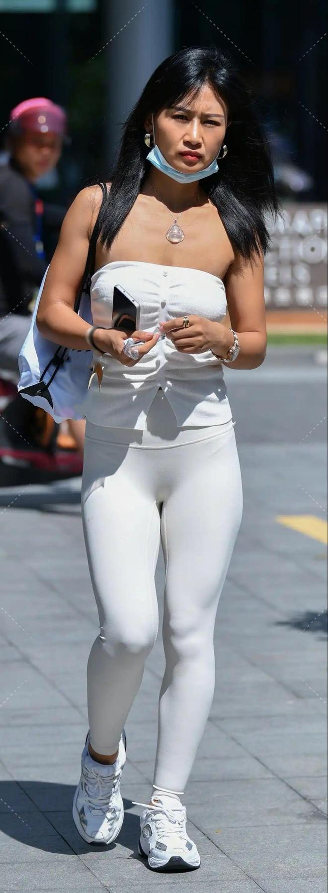 图中的女士便是如此,一身白色瑜伽套装将她的肌肉线条衬得格外鲜明。抹胸上衣下,肩臂的肌肉紧实且富有张力,同色瑜伽裤紧紧贴合腿部,每一处线条都透着自律带来的力量感。这种肌肉感并非笨重,而是充满活力的健康姿态,与瑜伽裤的舒适弹性完美融合,行走间的每一个动作都散发着自信,打破了人们对瑜伽裤穿搭的固有认知,让 “力量感” 成为时尚表达的一部分。