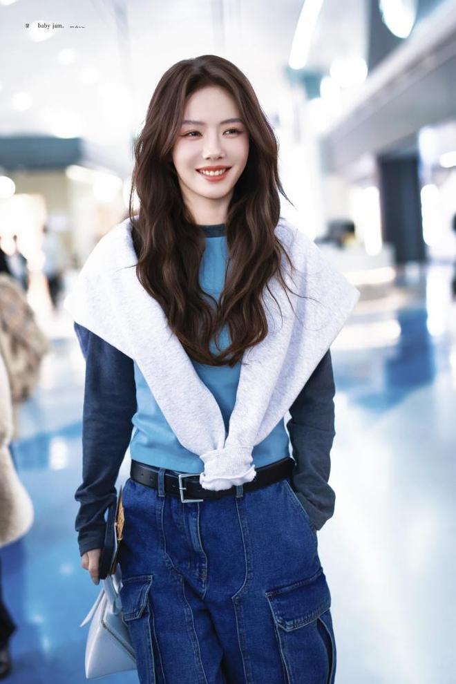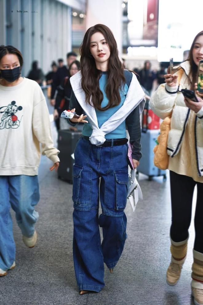 蔡文静此次的穿搭,将 “层次感” 与 “色彩呼应” 演绎得淋漓尽致。上半身,她选择了一件蓝色撞色插肩袖长 T 恤作为内搭,蓝色本身自带清新感,在秋季的沉闷氛围中格外亮眼,插肩袖设计则增添了几分休闲与随性,避免了常规 T 恤的单调。更巧妙的是,她在外面搭配了一件灰白色卫衣作为披肩,这种 “披肩式” 穿法不仅在秋季能起到保暖作用,还瞬间为造型增加了层次感,灰白色与蓝色形成柔和对比,整体色调和谐统一,既不浮夸又充满设计感,完美平衡了休闲与时尚。